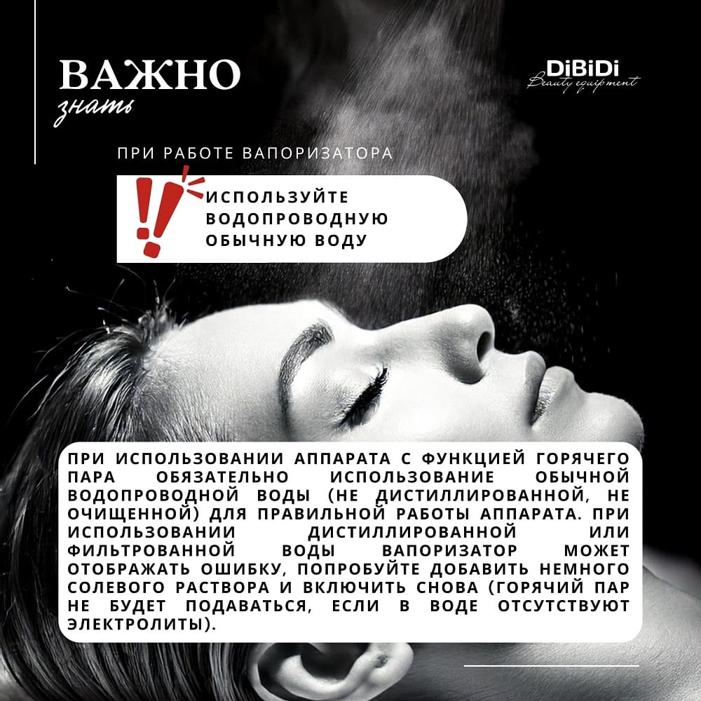 При использовании аппарата с функцией горячего пара обязательно использование обычной водопроводной воды (НЕ дистиллированной, НЕ очищенной) для правильной работы аппарата. При использовании дистиллированной или фильтрованной воды вапоризатор может отображать ошибку, попробуйте добавить немного солевого раствора и включить снова (Горячий пар не будет подаваться, если в воде отсутствуют электролиты).