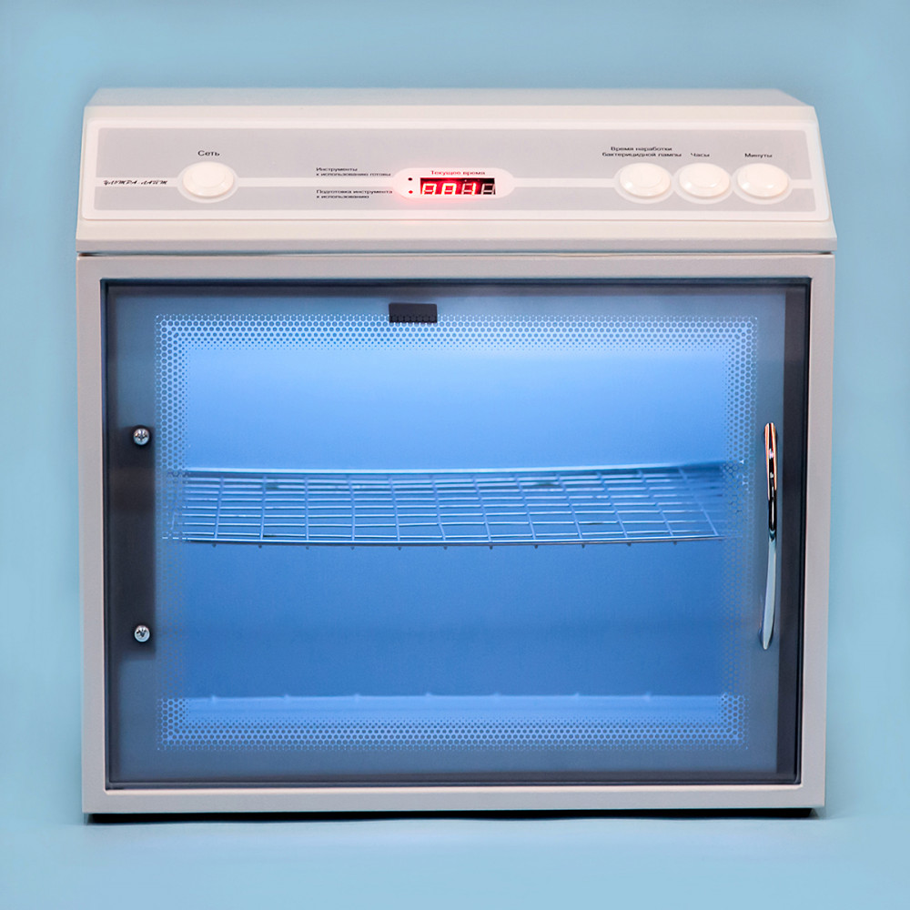 металлического корпуса с дверцей из каленого стекла, которое не позволяет УФ-излучению выходить за пределы камеры;