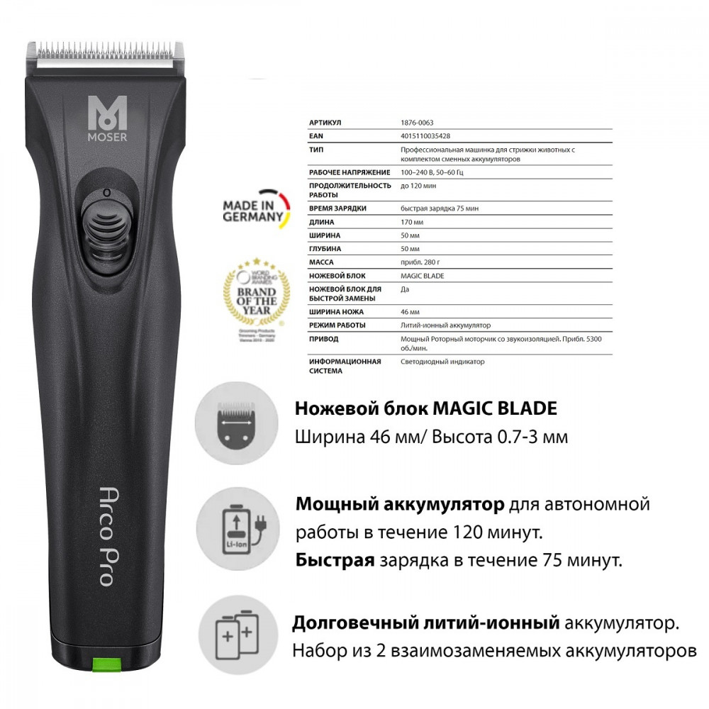 Машинка для стрижки животных Moser Animal clipper Arco Pro Black 1876-0063, две батареи
