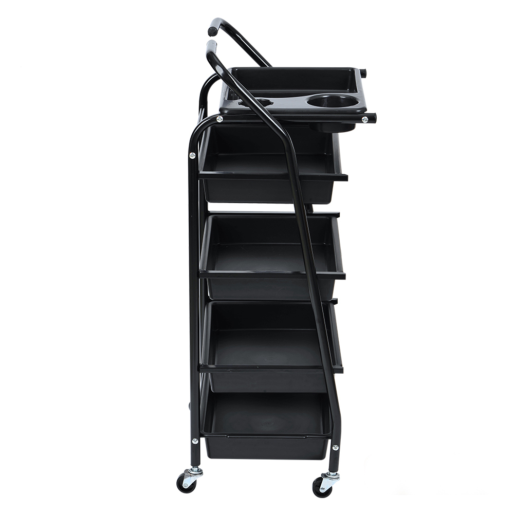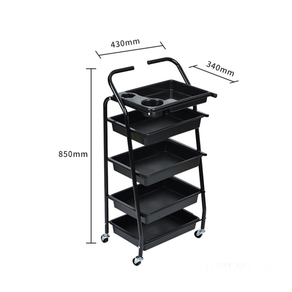 Практичная, относительно недорогая и надежная парикмахерская тележка для салонов красоты и барбершопов. Выполнена и прочного пластика и оборудована пятью выдвижными ящиками-лотками, а также верхней полкой с множеством отверстий для фенов, мисок для краски, брашингов и прочего парикмахерского оборудования. Надежные нешумные колеса. Пластик пригоден к различной химической обработке и чистке.