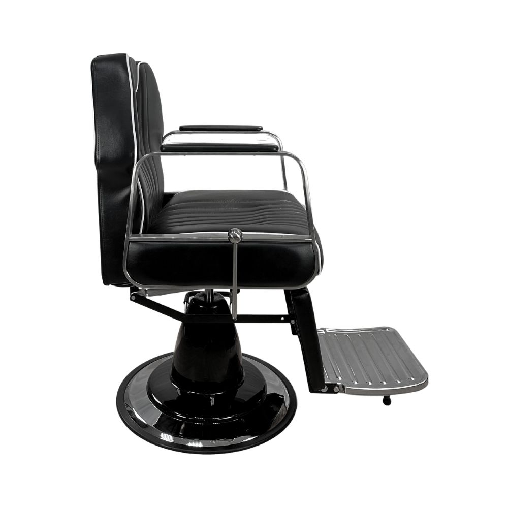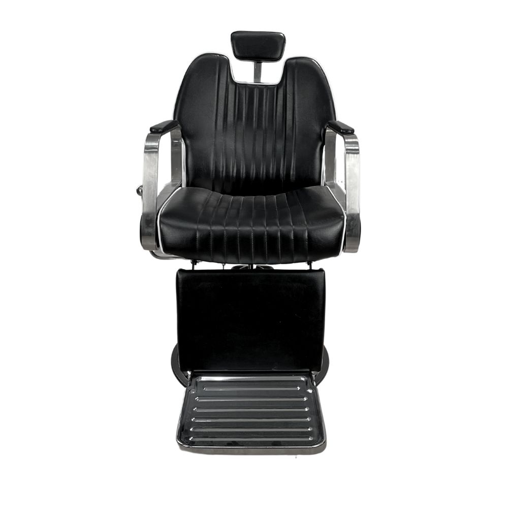 Кресло также оснащено подножкой, которая обеспечивает комфорт и удобство во время процедур. С правой стороны кресла есть рычаг, благодаря которому с помощью пневматического механизма кресло раскладывается до полулежачего положения. Откидная спинка и подножка позволяют раскладывать их, создавая идеальное положение для процедур бритья и других салонных процедур. Это дает возможность клиентам насладиться полной расслабленностью и комфортом во время сеанса.