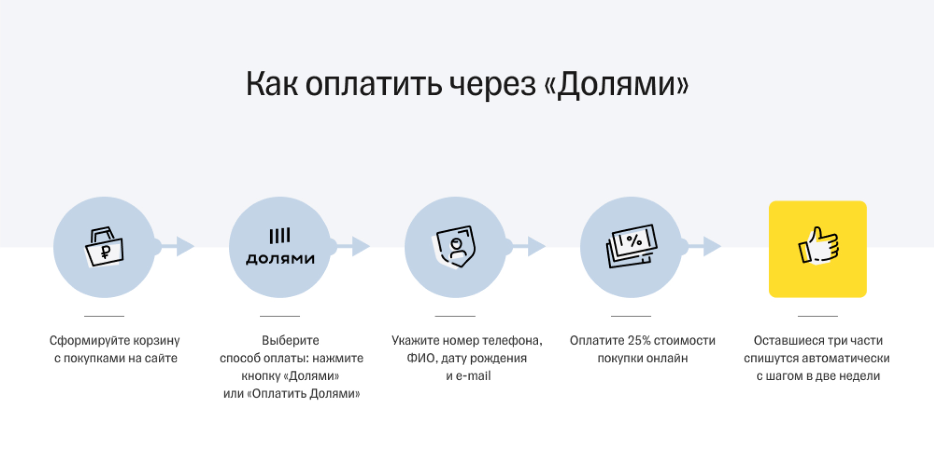 Сервис «Долями» делит сумму покупки на четыре равных платежа — без комиссии и дополнительных плат. Вам не нужно платить всю сумму сразу, получите товары после оплаты первой части.